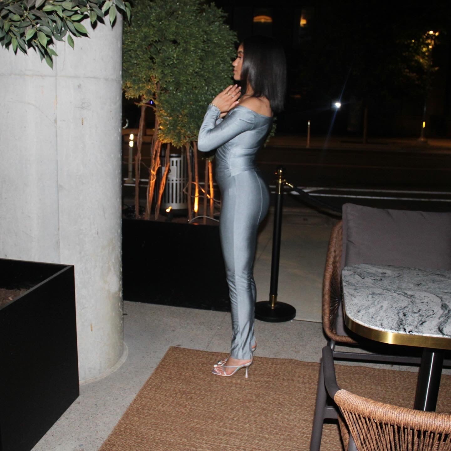 Turn heads in this sleek metallic two-piece set featuring a low v neck long sleeve top and curve-hugging pants chic, bold, and made for the spotlight!